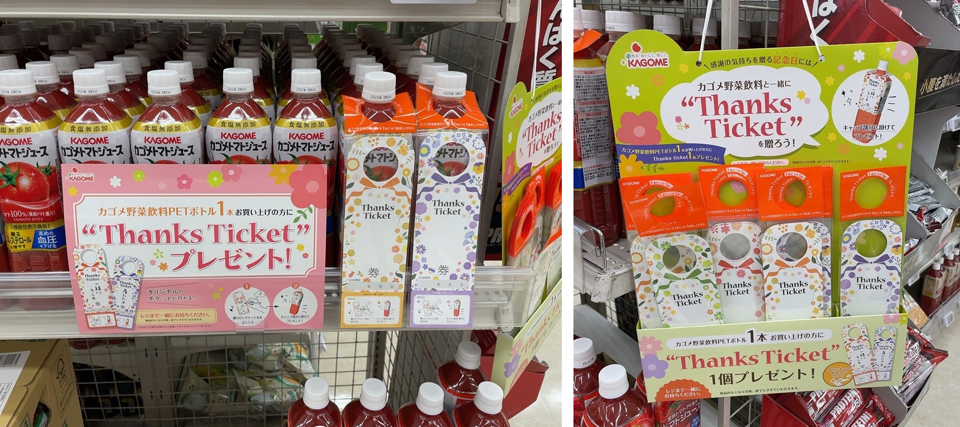 カゴメは、父の日にあわせて野菜系飲料売場で“Thanks Ticket”を展開していました。チケット表面は「___券」となっており、空白を埋めてオリジナルの○○券がつくれるというもの。それを野菜飲料のボトルにぶら下げて父に贈ってみたらどうでしょう?という意図の提案ツールであります。これ、父の日に絶妙にマッチする施策だと思うのです。