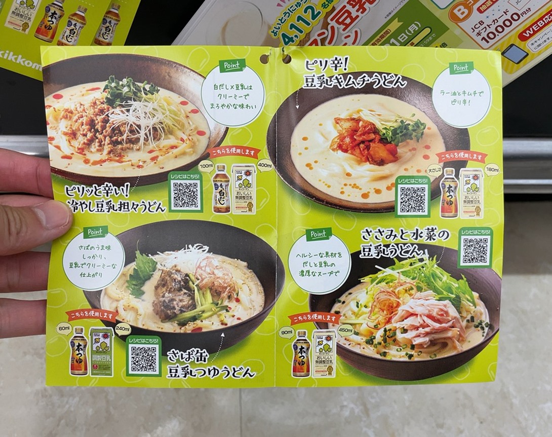キッコーマンが「夏の豆乳めんレシピ」を配布していました。レシピリーフレットであるにもかかわらず、レシピの記載が一切ないのが特徴的です。