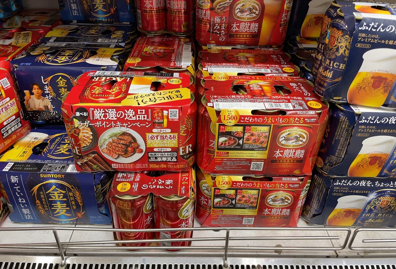 お気づきになりましたか?よく見ると中央の2つの商品は別ブランドなのです。右はキリンの「本麒麟」、左はサントリーの「金麦ザ・ラガー」です。